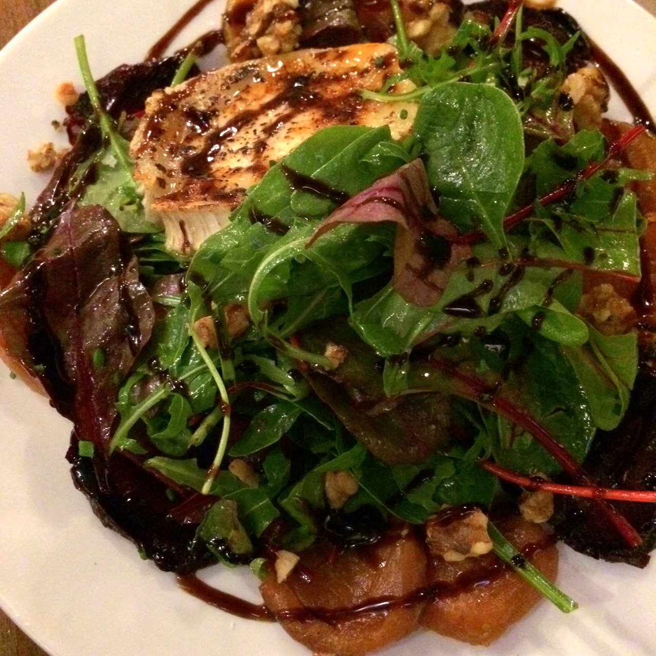The hake was well cooked and served in a creamy sauce prawns and with asparagus, lovely but overshadowed by the ribs. The beetroot and goats cheese salad was delicious, elevated by caramelised walnuts – a great winter salad.