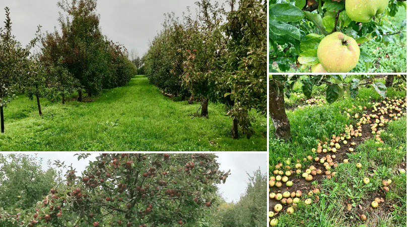Looking down the rows, some apples are still on the trees as they’ve not quite ripened, others have fallen on the ground. But nothing goes to waste, these are collected up as others are harvested. The trees are pruned very specifically to allow machines to do the harvesting and even shaking the trees to ensure all are collected.
