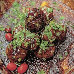 - Combine the cooked meatballs with the glaze and transfer to a serving bowl. Garnish with the reserved coriander.